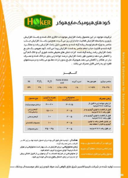 این محصول یک محلول غنی شده با اسید هیومیک و اسید فولیک است که بعنوان یک مکمل غذایی و ایده آل برای خاک های فقیر از نظر مواد غذایی می باشد. نتیجه اثر این محصول این است که ظرفیت تبادل یونی خاک را بالا برده و نهایتا باعث حاصلخیزی خاک می شود. این محصول چه برای استفاده به عنوان کود آبیاری و چه برای محلول پاشی باید بصورت محلول در آب استفاده گردد و برای محصولاتی که به شیوه قطره ای آبیاری می شوند بسیار ایده آل می باشد.
