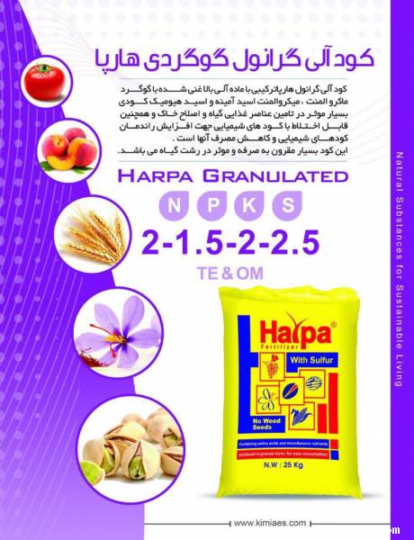 کودآلی گوگردی هارپا با هدف تامین عناصر مورد نیاز گیاه و بالابردن ماده آلی خاک و همچنین اصلاح ساختمان خاک و افزایش راندمان جذب عناصر غذایی و کودهای شیمیایی مصرفی در طول دوره رشد تولید شده است که به دلیل داشتن ظاهر گرانول به راحتی با کودهای شیمیایی همگن شده و در مخزن کود کار یا کودپاش به راحتی با دیگر کودها قابل اختلاط و مصرف می باشد.