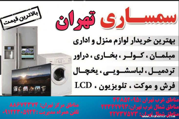 سمساری تهران خریدار کلیه لوازم منزل با بالاترین قیمت که شامل اجناس لوکس دست دوم-مبلمان-ال سی دی-ماشین لباسشویی-رختشویی-ظروف انتیک و قدیمی -فرش دستباف تبریز -کاشان و قم و تابلو فرش و قالیچه و اجناس کریستال و بلور و دکوری و مجسمه و پیانو و حتی خورده ریز منزل در محل می باشد.