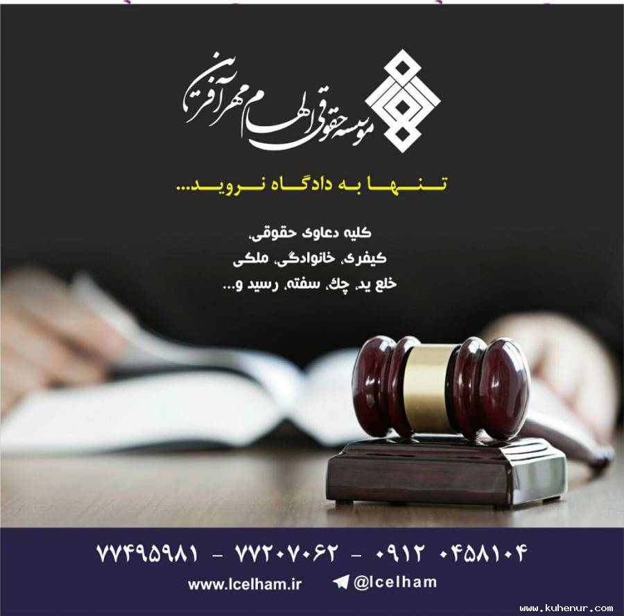 موسسه حقوقی الهام با وکلای متخصص و مجرب بهترین مشاور و وکیل شما جهت انجام کلیه دعاوی حقوقی، کیفری، ثبتی، ملکی، اموراداری، عقد قراردادهای داخلی و خارجی و خانواده: - نامزدی و خسارات ناشی از برهم زدن آن - مهریه - جهیزیه - نفقه زوجه و اولاد - ترک انفاق - طلاق - حضانت و ملاقات طفل - ازدواج مجدد - اهدای جنین و... - تهران - نارمک – میدان هفت حوض _ آیت شمالی – خیابان خاموشی – پلاک 150- طبقه سوم - واحد 11 - تلفن : 02177207062_02177495981 -