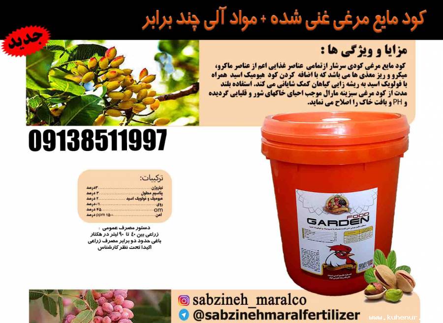 فروش عمده از درب کارخانه با آغاز طرح سراسری شرایط فروش سه ماهه تاثیرات کود مرغی مایع روی گیاه: – افزایش جذب عناصر غذایی پر مصرف از جمله فسفر و نیتروژن – تسریع جوانه زنی – افزایش مقاومت گیاه به تنشهای محیطی – افزایش تحریک آنزیم و هورمونهای گیاهی – قابلیت کلات کنندگی عناصر ریزمغذی مانند آهن – افزایش جذب کودهای شیمیایی و مواد معدنی خاک – تحریک فعالیت ریشه ها کود مرغی مایع نکات فنی: – افزایش فعالیت میکرو ارگانیسمهای مفید خاک – اصلاح اسیدیته خاک(PH) – کاهش شوری خاک عصاره مایع مرغی کود مرغی کود مرغی مایع مایع مرغی