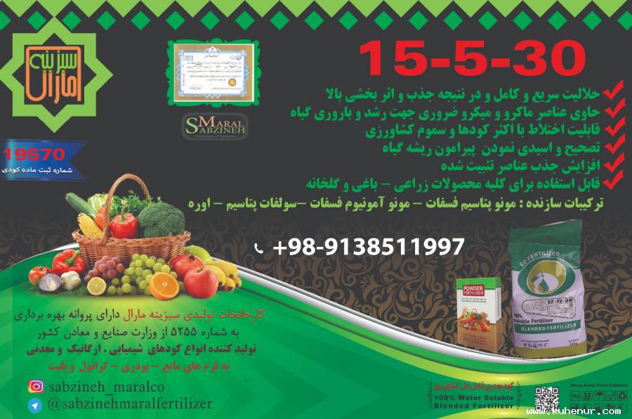 #کود_پودری_N-P-K (15-5-30) گروه تولیدی سبزینه مارال عناصر اصلی نیتروژن، فسفر و پتاسیم مورد نیاز گیاه را تامین می کند.