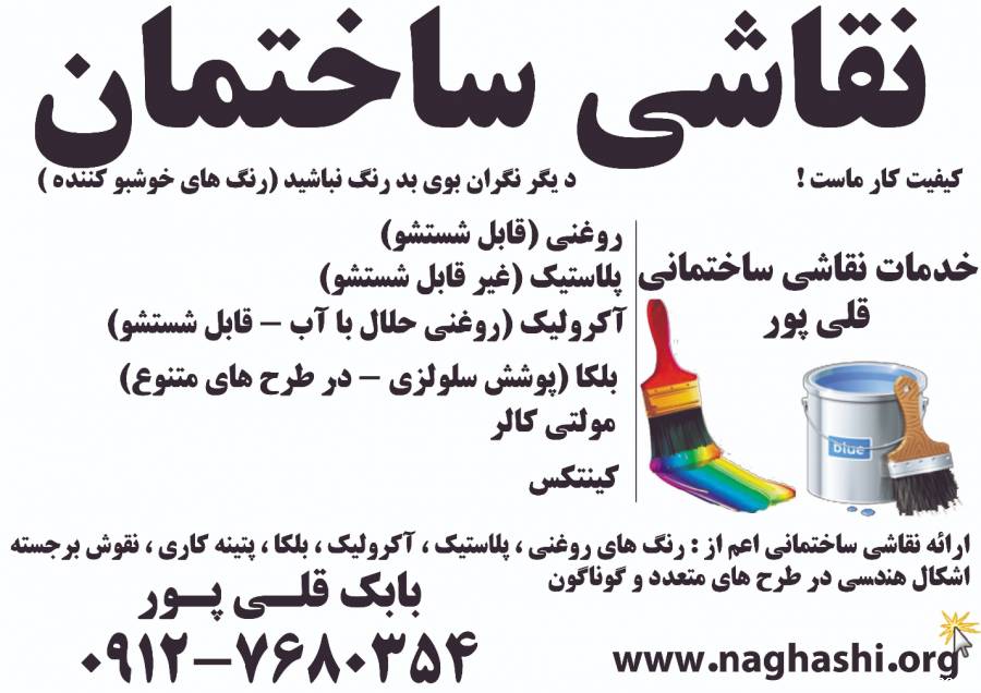 . بلکا - کاغذ دیواری - پتینه کاری - رنگ آمیزی انواع درب های چوبی و فلزی - اجرای پوشش صنعتی - اپوکسی - اجرای رنگ های فوری مخصوص چوب / سیلروکیلر / پلی استر / نیم پلی استر - اجرای رنگ های نما /رنگ نما / رولکس / کنیتکس - اجرای رنگ آمیزی استخر ها / رنگ استخر - رنگ آمیزی انواع چهارچوب های فلزی / با شیشه و بدون شیشه - اجرای انواع پوشش های ضد زنگ برای اسکلت ساختمان ها و غیره