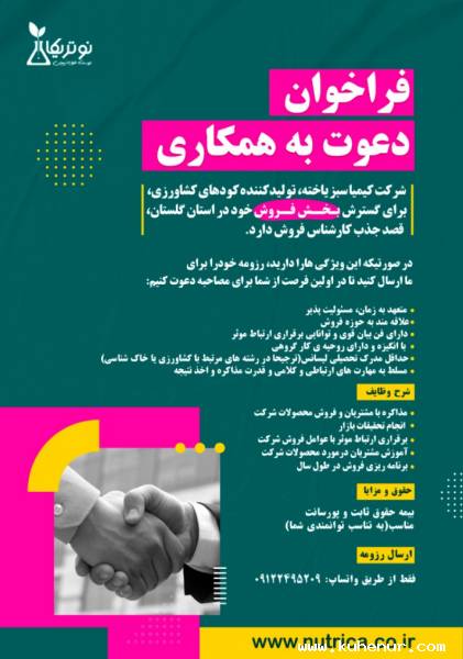 شرکت کیمیا سبز یاخته، تولیدکننده کودهایکشاورزی، برای گسترش بخش فروش خود در استان گلستان، قصد جذب کارشناس فروش دارد.