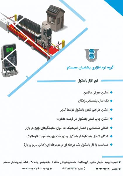 این نرم افزار برای باسکول های عمومی و جاده ای طراحی شده است . هدف از تولید این نرم افزار سرعت بخشیدن و آسان نمودن عملیات توزین توسط کاربر می باشد. 1.معرفی ماشین و تجهیزات با امکان تعیین مشخصات آن ( نوع ماشین , خالی بار)... , 2.امکان توزین یک مرحله ای و 2 مرحله ای و متفرقه و چاپ برگه باسکول آن 3.امکان تعریف کرایه حمل , هزینه باسکول , هزینه بارگیری برای هر توزین 4.امکان توزین دستی ( بدون اتصال به نمایشگر باسکول) 5.امکان تهیه گزارشات توزین به صورت روزانه , ماهانه , ساالنه 6.امکان تهیه لیست توزین های یک ماشین و یا یک کاال 7.امکان تعریف درصدهای ارزش افزوده و اعمال آن در رسید های توزین 8.امکان اتصال به انواع نمایشگر های باسکول رایج در بازار و تنظیم آن توسط خود کاربر 9.امکان تعریف کاربر در سیستم و تعیین سطح دسترسی برای هر کدام 10.امکان تهیه گزارش از میزان کارکرد صندوق برای هر روز 11.امکان طراحی گزارشات و برگه های باسکول توسط خود کاربر