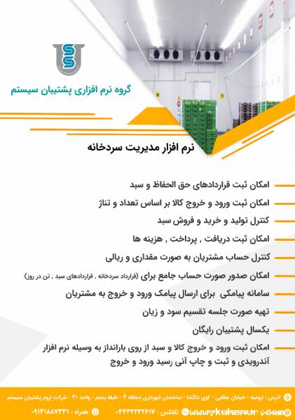 نرم افزار مدیریت سردخانه برای کنترل ورود و خروج کاال، قرارداد های حق الحفاظ و سبد، کنترل تراکنش های مالی، کنترل تولید، خرید و فروش سبد و مدیریت هزینه ها تولید شده است. امکانات نرم افزار امکان ثبت قرارداد های حق الحفاظ و قرارداد سبد مشتریان امکان ثبت ورود و خروج کاال به دو صورت دستی و باسکول امکان اتصال نرم افزار به انواع نمایشگرهای باسکول رایج در بازار امکان ثبت تولید، خرید، فروش سبد و کنترل موجودی ریالی و مقداری آن امکان کنترل حساب ریالی و مقداری مشتریان به تفکیک قرارداد امکان ثبت دریافت و پرداخت و هزینه ها) نقد، چک، حواله( امکان ثبت صورتحساب برای قراردادها امکان محاسبه تن در روز به صورت اتوماتیک امکان گزارش گیری از حساب مشتریان ) ریالی و مقداری ( امکان گزارش گیری از سبد تولیدی، خریداری شده و فروش رفته امکان تعریف کاربر و معرفی سطوح دسترسی ارسال پیامک به صاحب بار سال اول کاری ارائه خدمات پشتیبانی رایگان میباشد امکانی جدید و انحصاری در نرم افزار مدیریت سردخانه پشتیبان سیستم امکان ثبت ورود و خروج با استفاده از تبلت از روی بارانداز و ذخیره اتوماتیک در کامپیوتر سرور بدون نیاز به اینترنت با استفاده از نسخه موبایل نرم افزار ارسال همزمان پیامک به صاحب بار و چاپ رسید ورود و خروج در کمتر از 5 ثانیه همزمان با ذخیره و ارسال پیام