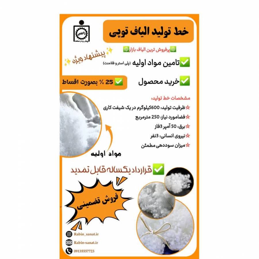 پر فروش ترین الیاف بازار میزان سوددهی مطمئن تامین مواد اولیه توسط شرکت و خرید تضمینی از شما پیشنهاد بسیار ویژه بصورت نقد و 25% اقساط برای اطلاعات بیشتر با شماره 09135557723 تماس بگیرید . آدرس اینستاگرام: rabin_sanat.ir آدرس سایت: www.rabin-sanat.ir آدرس ایتا :https://eitaa.com/Rabin_sanat