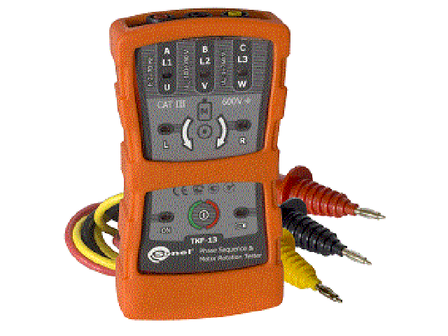 دستگاه تست توالی فاز و جهت چرخش موتورها سری TKF در دو مدل TKF 12 - TKF13 ساخت کمپانی Sonel توانایی ها : شناسایی توالی فاز شناسایی وجود فاز ها شناسایی جهت چرخش موتورها